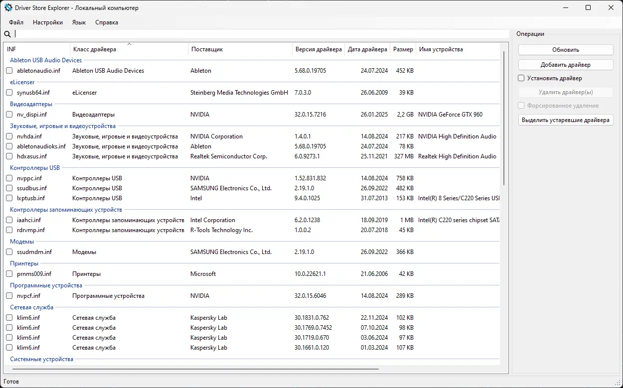 Driver Store Explorer сочетает в себе простоту интерфейса и мощные функции управления драйверами. Он поддерживает как онлайн, так и офлайн режимы работы, что расширяет сферу применения. Графический интерфейс позволяет быстро ориентироваться в списке драйверов, а возможность группировки и изменения порядка столбцов упрощает анализ данных. С другой стороны, программа не избавляет от необходимости понимать, какие драйверы безопасно удалять, и не предоставляет автоматизированного анализа совместимости.
