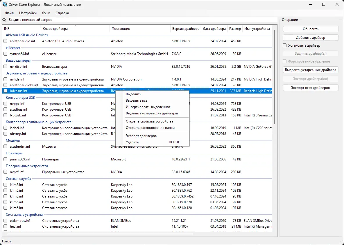 Driver Store Explorer — это компактное приложение для управления хранилищем драйверов в системе Windows. Оно позволяет просматривать, добавлять, удалять и экспортировать драйверы, а также освобождать место на диске за счёт очистки устаревших версий. Программа не требует установки и работает с правами администратора.