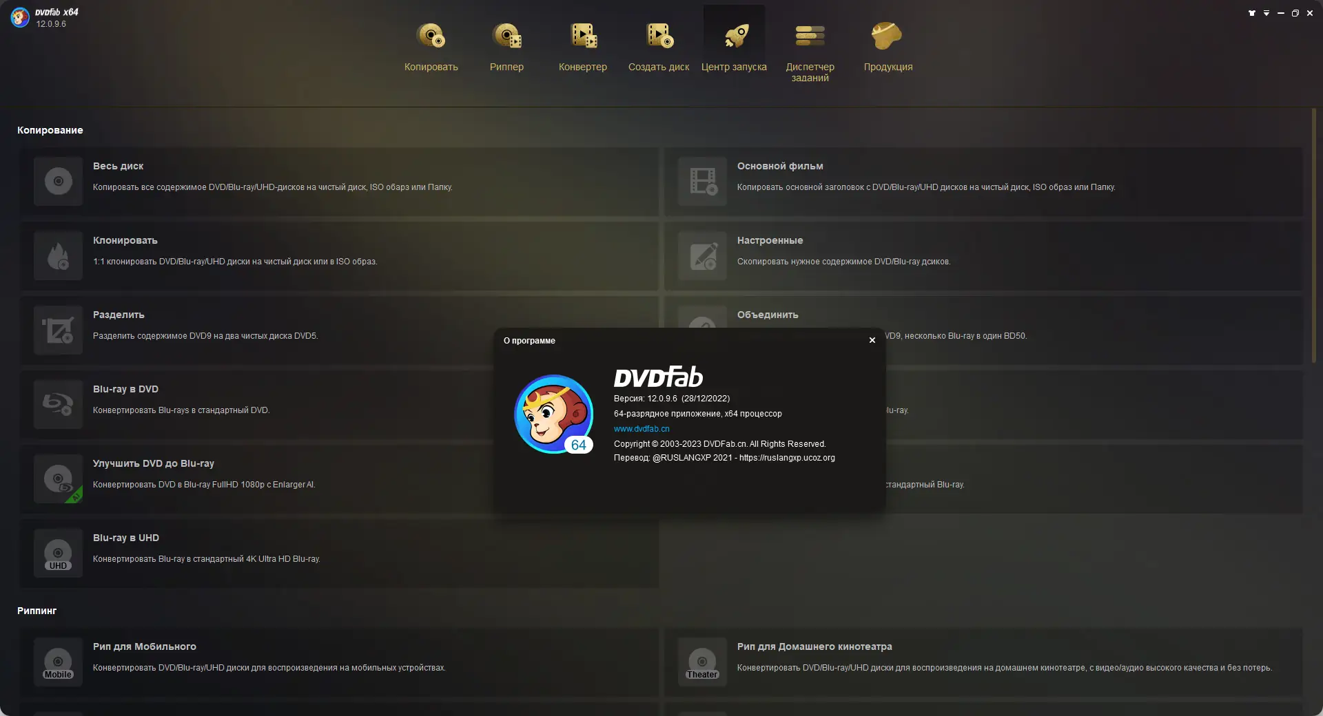 DVDFab — многофункциональное программное обеспечение для копирования, резервного копирования и конвертации DVD и Blu-ray дисков с полной поддержкой снятия защит, сжатия контента и адаптации под различные устройства. Программа позволяет сохранять фильмы в высоком качестве, удалять рекламу, обрезать ненужные части, пережимать диски и конвертировать их под мобильные гаджеты. Поддерживает широкий спектр форматов, включая DVD, Blu-ray, ISO-образы и видеофайлы с жесткого диска. Интерфейс интуитивно понятен, имеет русский язык и подходит как для новичков, так и для опытных пользователей.