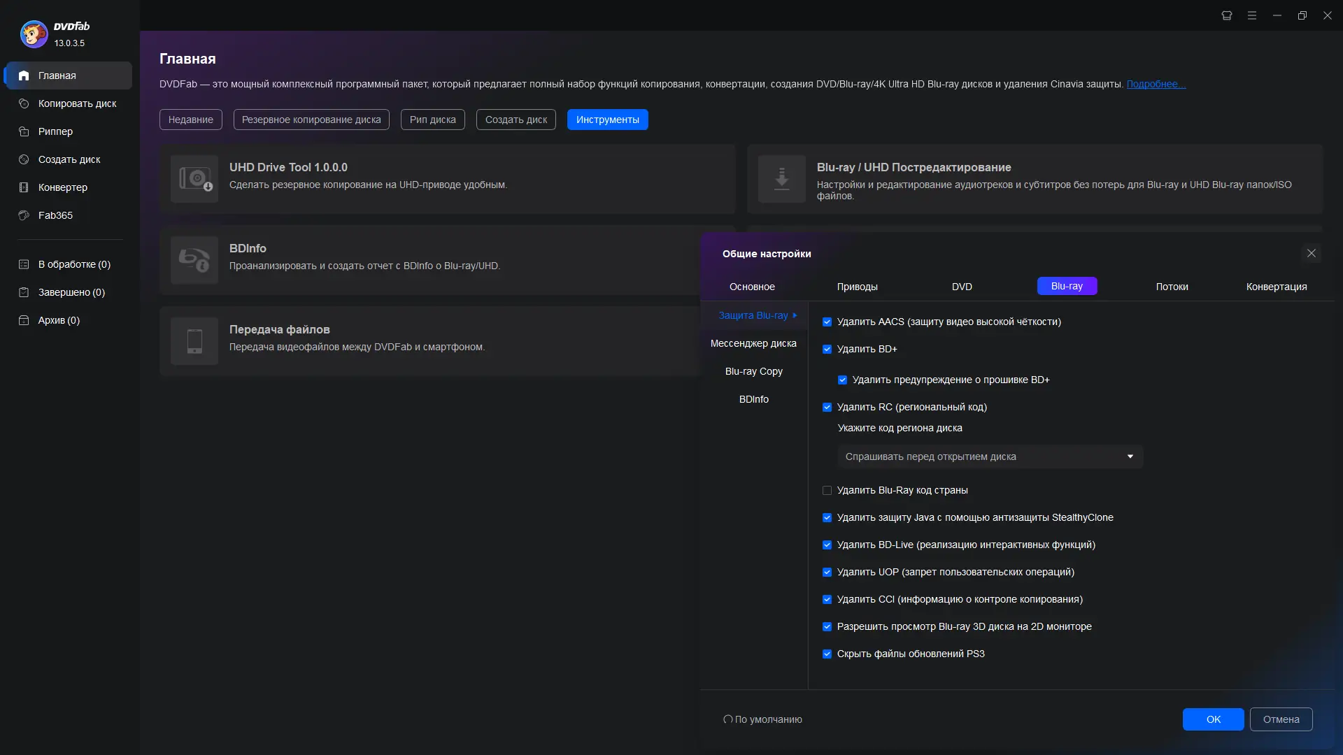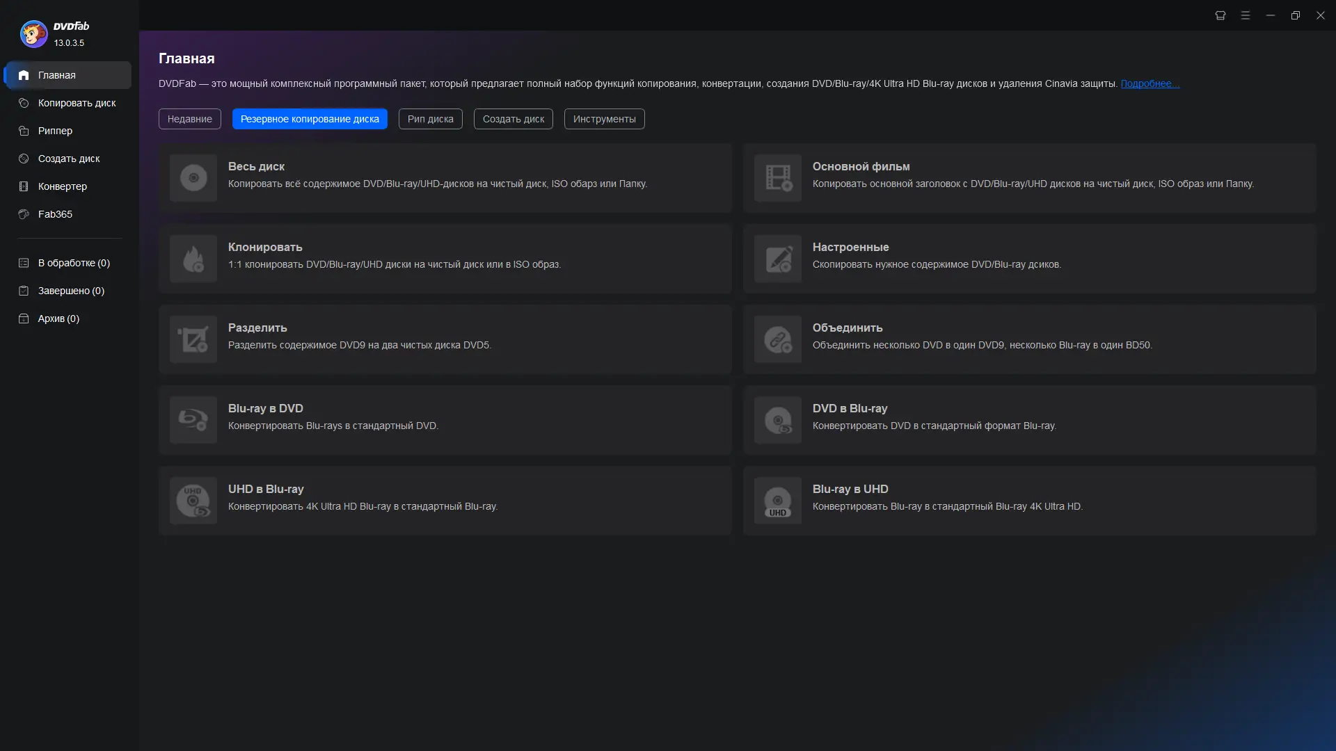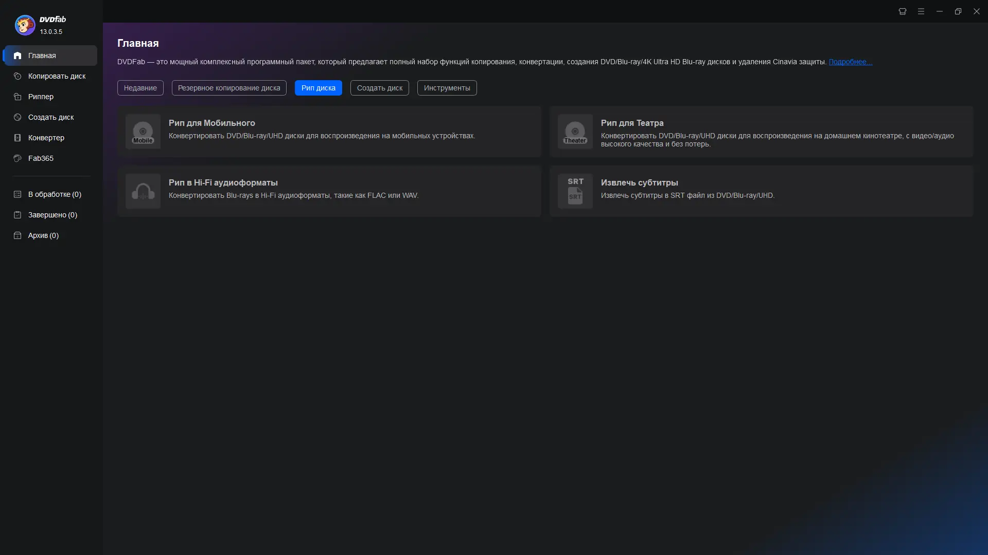 DVDFab — универсальное программное решение для работы с DVD и Blu-ray дисками, обеспечивающее высокоскоростное копирование, конвертацию, сжатие и запись медиафайлов с полным снятием защиты и поддержкой множества форматов. Инструмент сочетает в себе функции риппера, конвертера и записывающего приложения, позволяя сохранять фильмы в цифровом виде, переносить их на физические носители или оптимизировать под мобильные устройства. Программа поддерживает широкий спектр операций, включая создание резервных копий, удаление рекламы и субтитров, а также работу с многослойными дисками.