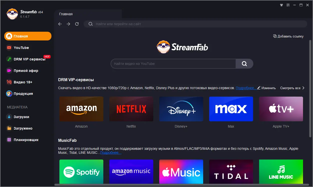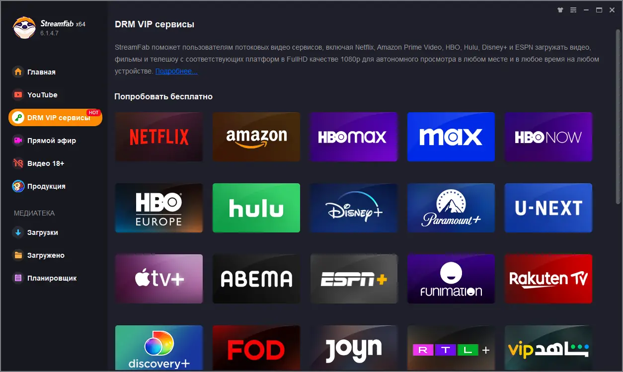 DVDFab StreamFab представляет собой универсальное решение для работы с видеоконтентом из онлайн-источников. Программа позволяет сохранять видео с таких сервисов, как YouTube, Netflix, Amazon Prime Video, Hulu и Disney+, обеспечивая высокое качество изображения и звука. Поддержка форматов включает 4K, HDR и другие современные стандарты, что делает возможным сохранение материалов в максимально возможном разрешении.