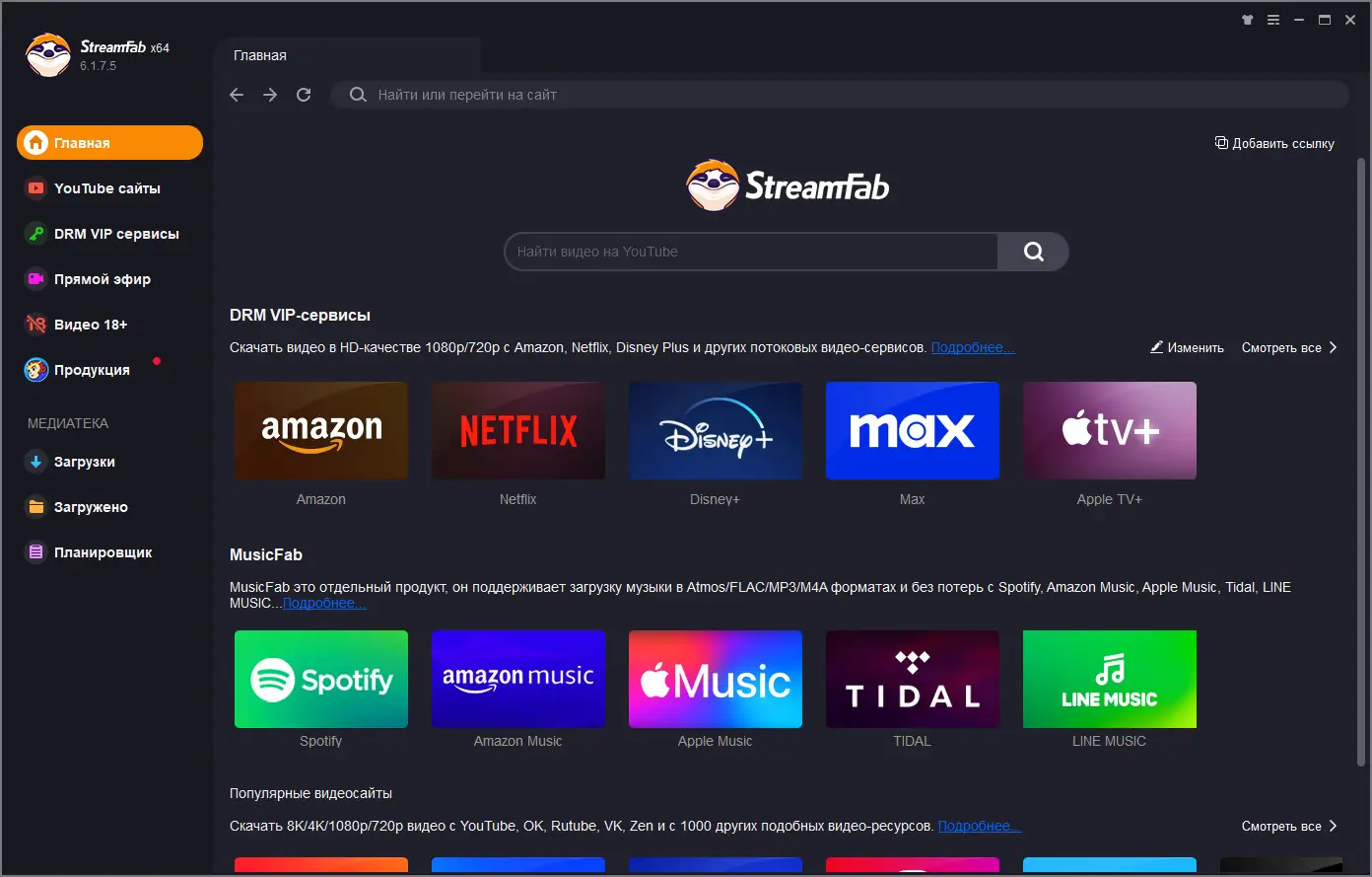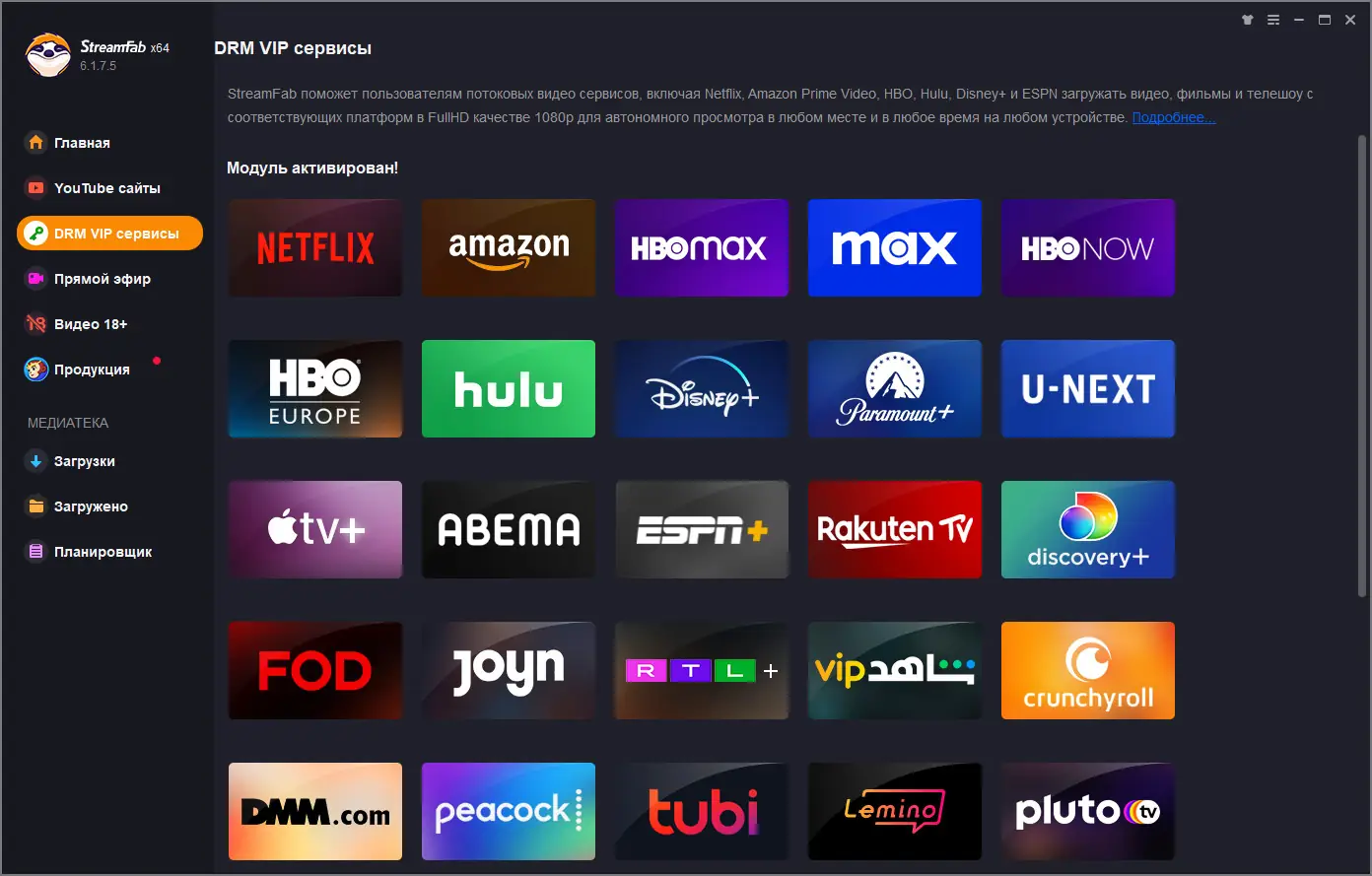 DVDFab StreamFab — программа для загрузки, конвертации и записи видео с популярных онлайн-платформ. Поддерживает высокие разрешения, включая 4K и HDR, а также работу с множеством сервисов, таких как Netflix, YouTube и Disney+.