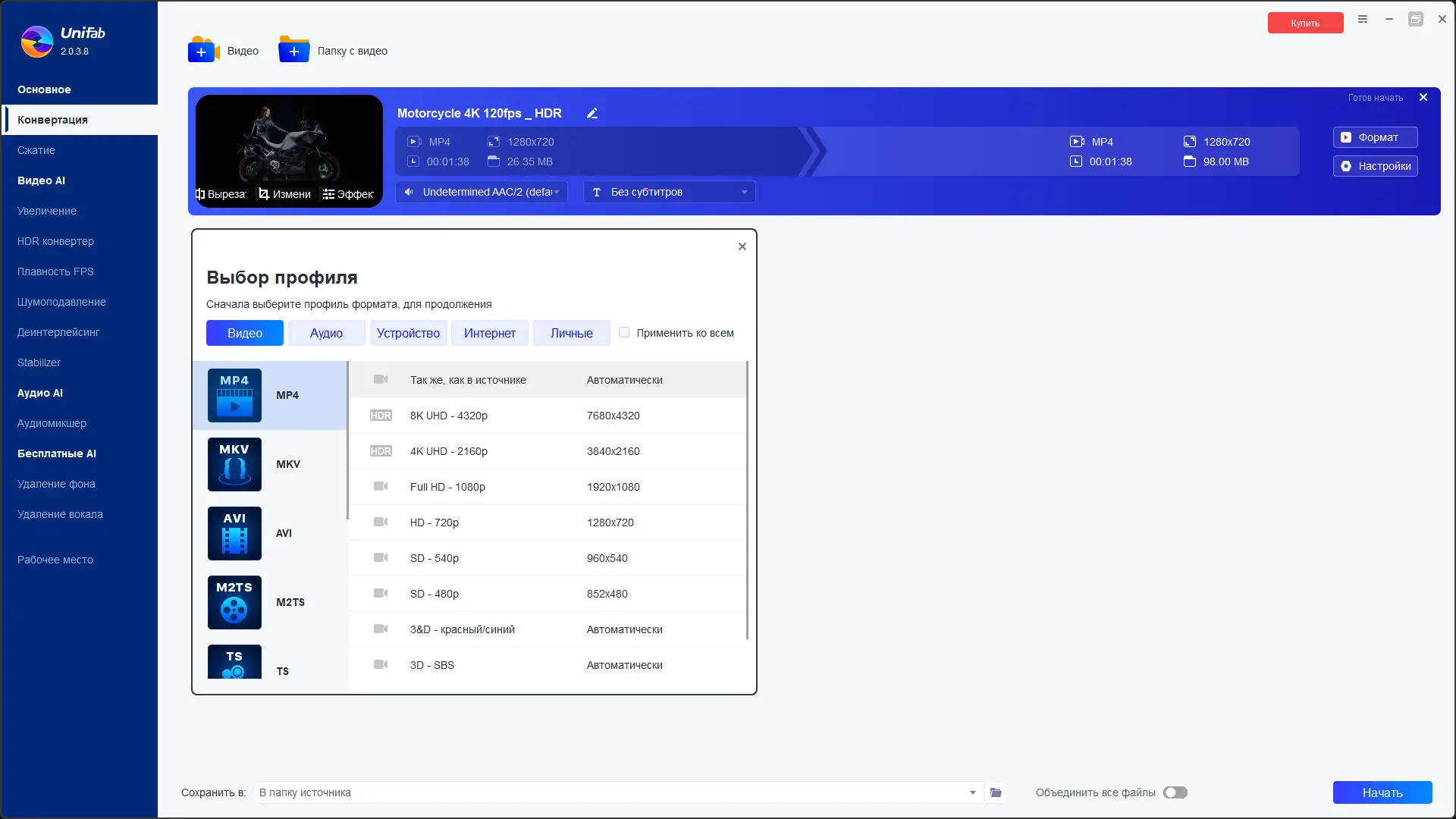 - Модуль Video Converter позволяет конвертировать и сжимать видео в более чем 1000 форматов с гибкими настройками кодеков и разрешений, включая поддержку UHD 8K и 4K