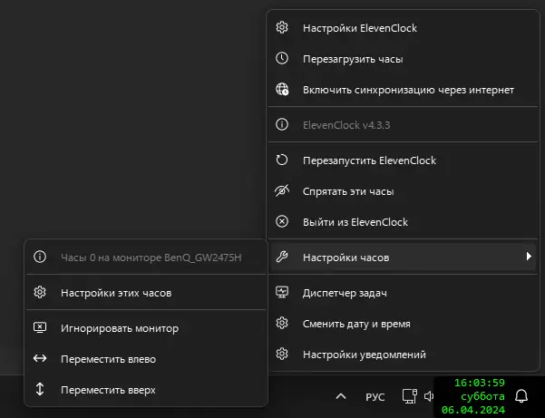 После установки ElevenClock автоматически запускается вместе с системой и отображает часы на панели задач. Через контекстное меню, вызываемое правой кнопкой мыши по циферблату, доступен полный набор настроек. Пользователь может изменить формат времени, например, добавить день недели или скрыть дату, оставив только время. Доступна настройка поведения — показывать часы поверх полноэкранных приложений или скрывать при необходимости. Также можно назначить действия на одиночный клик, двойной клик и нажатие средней кнопки мыши, например, открытие календаря, запуск приложения или сворачивание окон. Каждый монитор в системе может иметь собственные часы с уникальным оформлением и часовым поясом, что удобно для пользователей, работающих в разных временных зонах. Программа поддерживает темные и светлые темы, адаптируясь под системные настройки или позволяя задать собственный стиль.