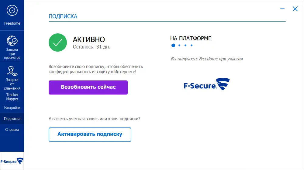 F-Secure Freedome VPN доступен для установки на устройства под управлением Windows. Поддержка актуальных версий операционной системы гарантирует стабильную работу и совместимость с современным программным обеспечением. Программа локализована на русский язык, что упрощает её настройку и использование для русскоязычных пользователей.
