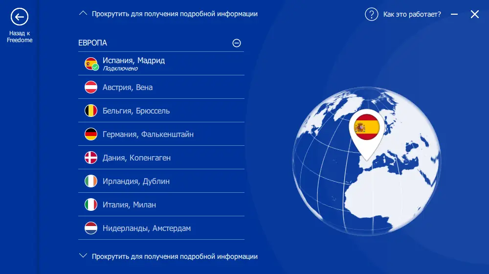 После установки программа запускается через ярлык на рабочем столе или в меню «Пуск». Основной интерфейс отображает статус подключения, текущее местоположение сервера и кнопку активации защиты. При первом запуске Freedome предлагает автоматически подключиться к ближайшему серверу для оптимальной скорости соединения. Пользователь может вручную выбрать страну из списка: доступны Амстердам, Лондон, Токио, Нью-Йорк, Сингапур и другие. После подключения весь трафик проходит через зашифрованный туннель, обеспечивая конфиденциальность. В настройках можно включить автоматический запуск, активировать защиту в публичных сетях и импортировать конфигурации. Для сброса триального периода используется файл Settings.reg, однако на территории России доступ к серверам заблокирован, поэтому операция требует предварительного подключения к другому VPN-сервису.