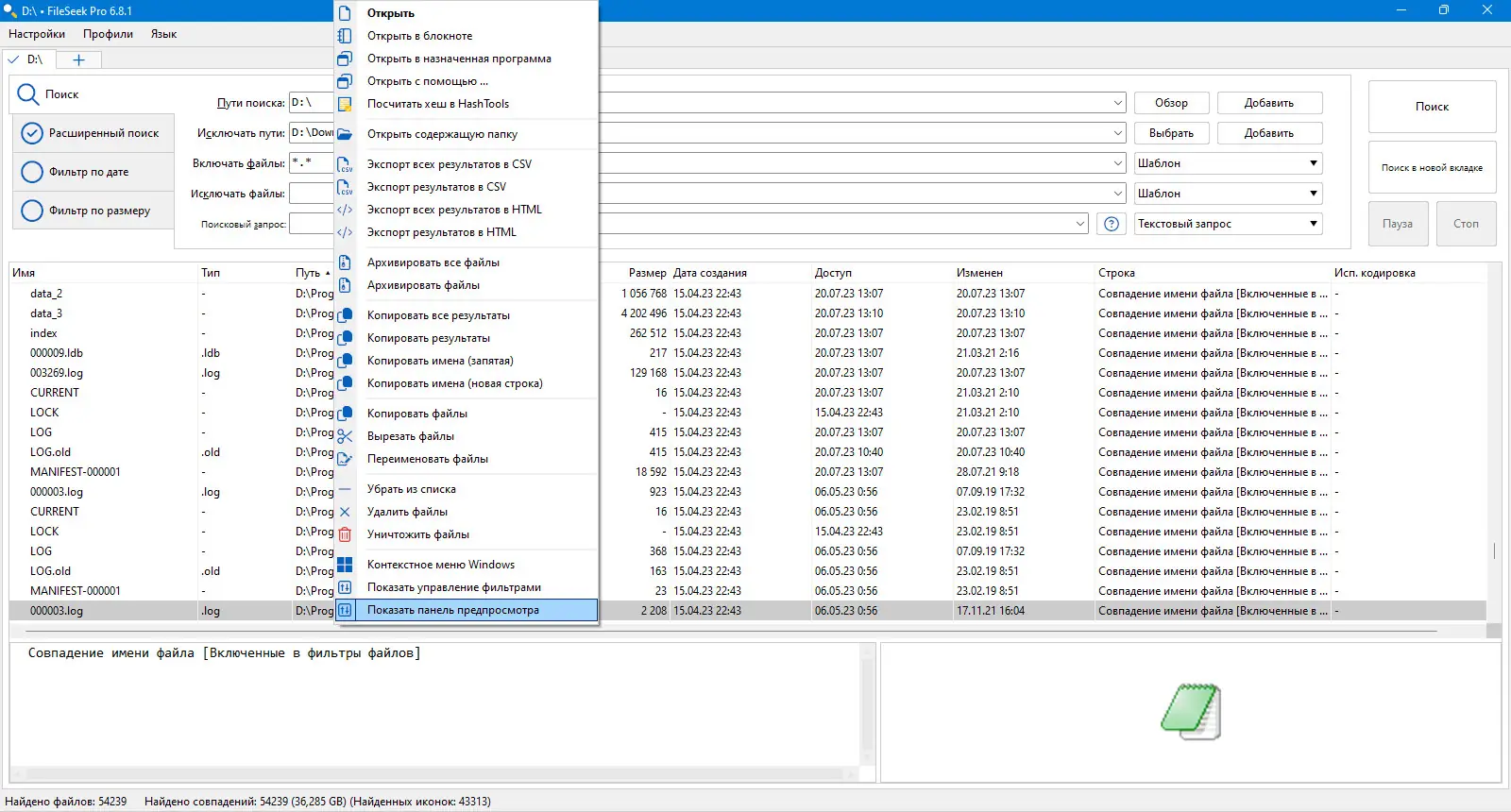 - Использует многопоточность для ускорения сканирования файлов и папок, обеспечивая молниеносный поиск даже на больших объемах данных.