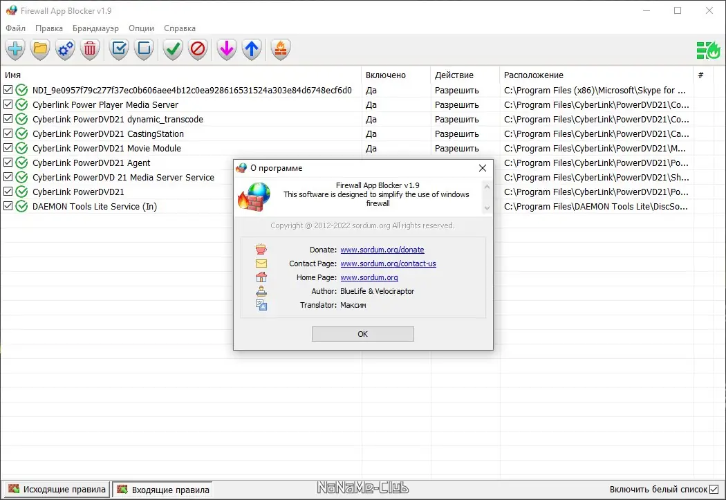Работа с утилитой предельно проста. Запустите FAB, после чего перетащите ярлык или исполняемый файл нужного приложения в его окно. Программа автоматически создаст правило, блокирующее входящие и исходящие подключения для этого файла. Также можно воспользоваться функцией обзора, чтобы вручную указать путь к программе. Через контекстное меню Проводника доступен быстрый вызов команды блокировки, что ускоряет процесс. После добавления приложение отображается в списке с указанием его статуса — заблокировано или разрешено. При необходимости правило можно удалить или временно отключить.