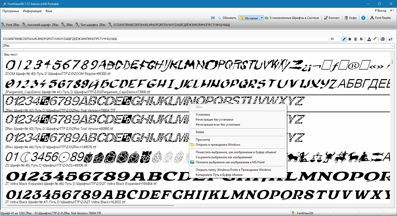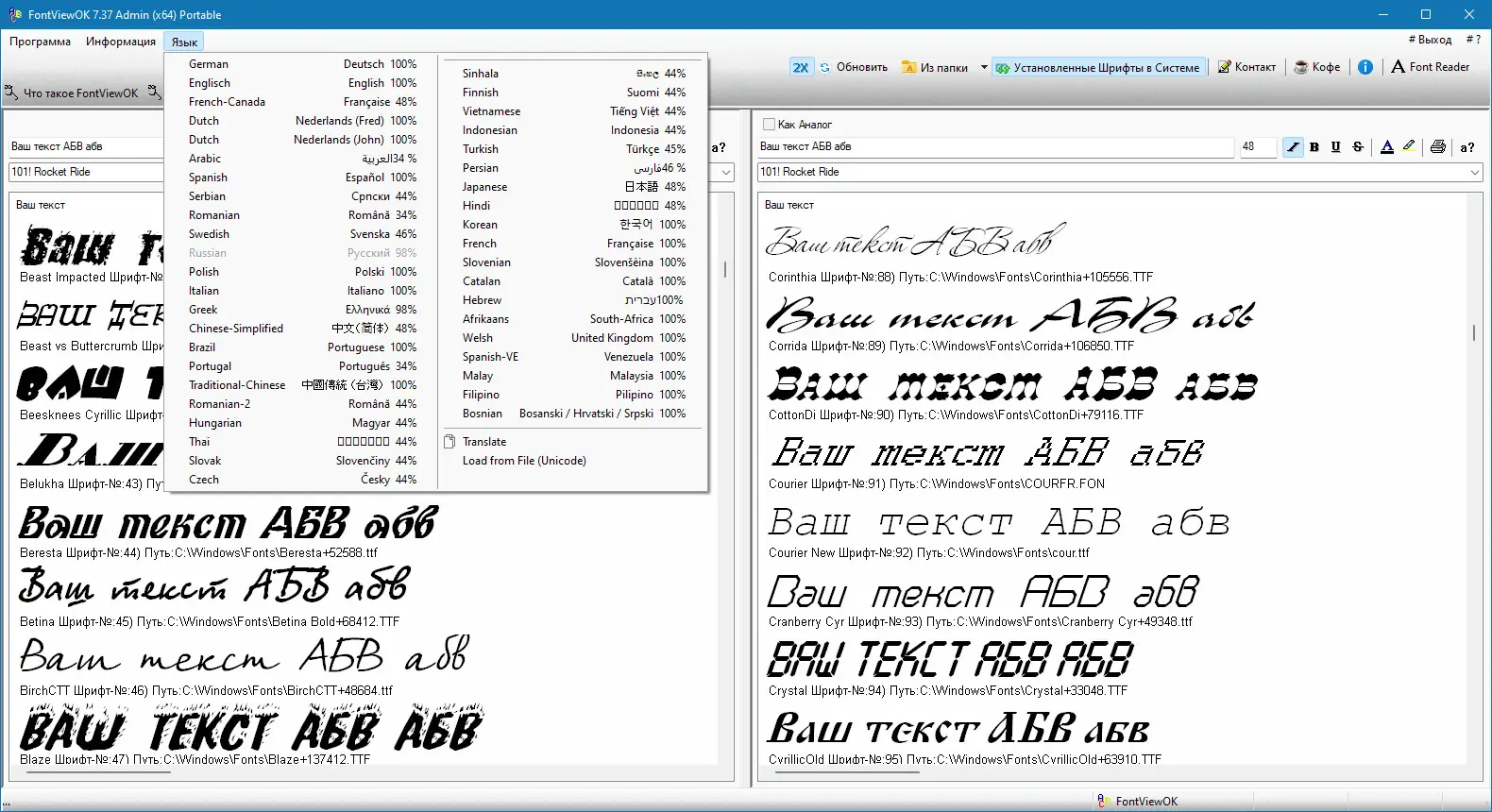 FontViewOK доступна для загрузки в портативной и установочной версиях. Обновление до версии 7.37 принесло улучшения в стабильность работы и актуализацию языковых файлов, включая русский интерфейс.