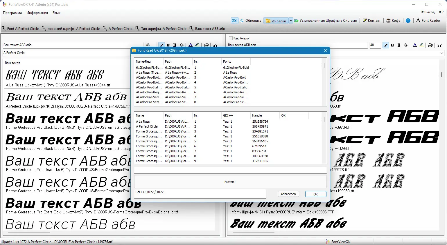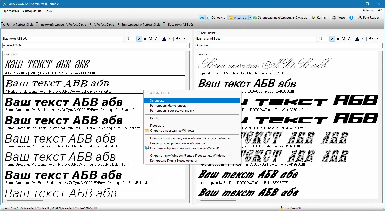 FontViewOK — компактное приложение для просмотра и анализа всех доступных шрифтов в системе с возможностью предварительного просмотра текста в выбранном начертании. Программа не требует установки и поддерживает настройку размера, цвета, стиля и других параметров отображения текста.