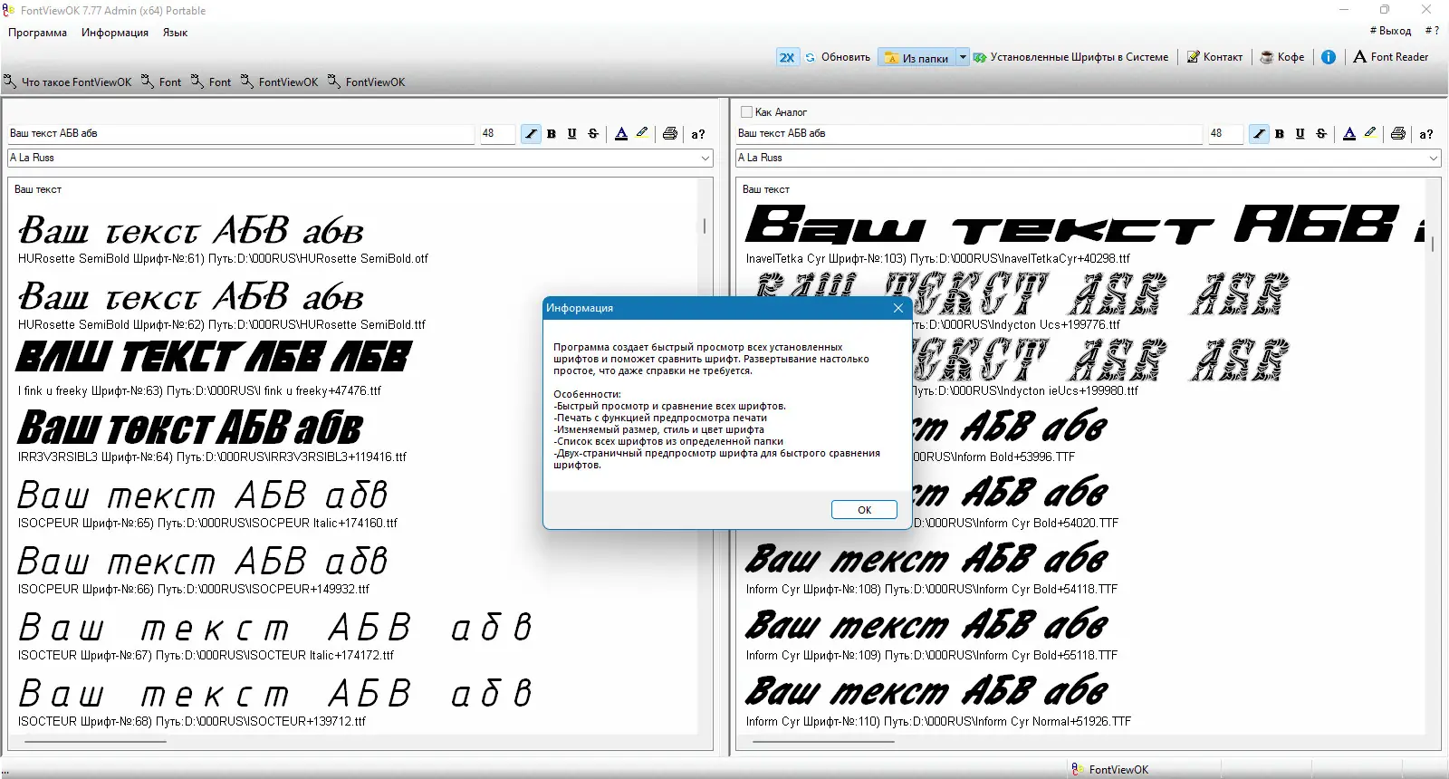 FontViewOK — компактное приложение для просмотра и анализа установленных шрифтов с возможностью предварительного просмотра текста в различных стилях. Программа поддерживает настройку размера, цвета, начертания и позволяет сравнивать два шрифта одновременно в отдельных окнах.