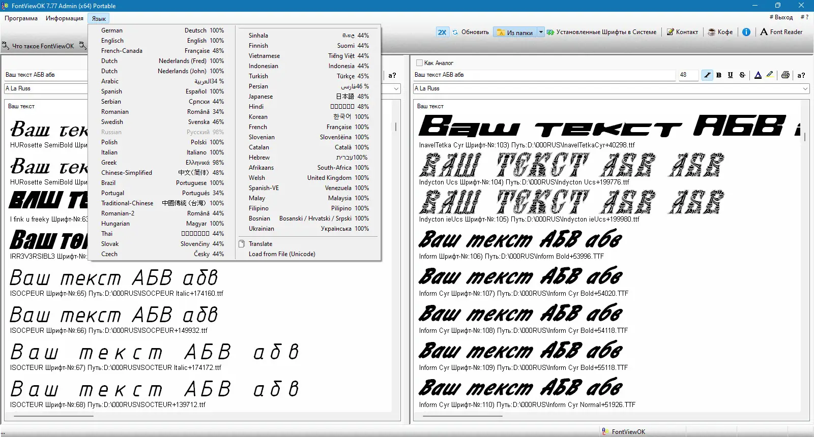Интерфейс программы интуитивно понятен и не требует дополнительных инструкций. После запуска пользователь видит список всех доступных шрифтов, из которого можно выбрать любой для просмотра. В специальное поле вводится нужный текст, и сразу отображается его внешний вид в выбранном шрифте. Обе панели просмотра работают независимо, что позволяет задавать разные параметры отображения для каждого шрифта. Можно менять размер шрифта, выбирать цвет заливки текста, включать полужирное или курсивное начертание. Программа также поддерживает масштабирование интерфейса, что удобно при работе на экранах с высоким разрешением. Все изменения отображаются мгновенно, без задержек и перезагрузок.