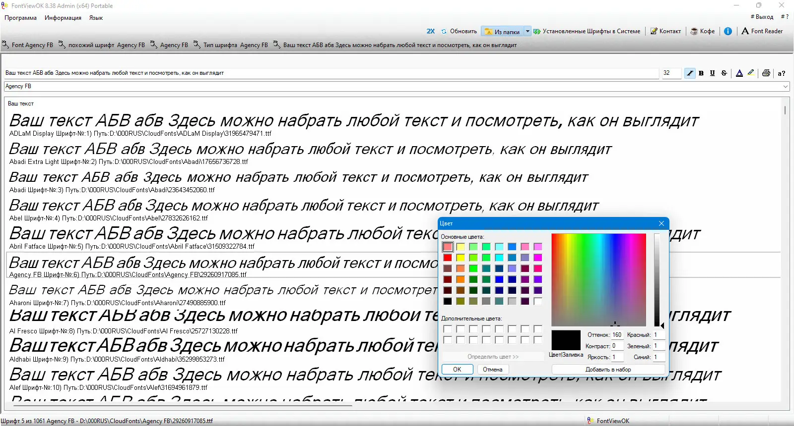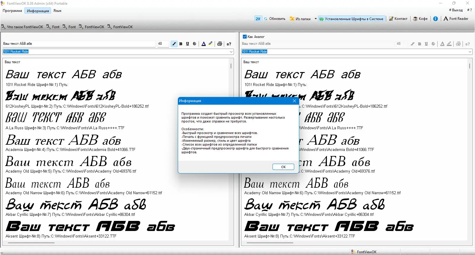 FontViewOK — это компактная утилита для просмотра и сравнения всех доступных шрифтов в системе с возможностью изменения текста, размера, цвета и стиля в реальном времени. Программа не требует установки и поддерживает портативный режим работы.