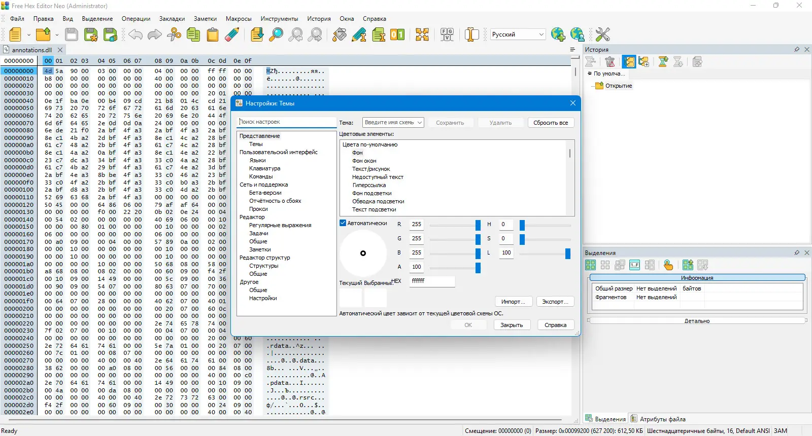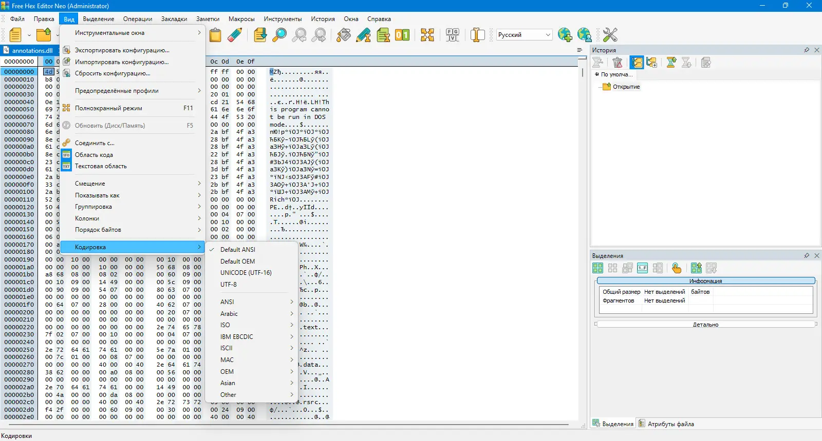 - Доступны стандартные операции редактирования: вырезание, копирование, вставка, заполнение выделения шестнадцатеричными значениями, импорт и экспорт бинарных данных.