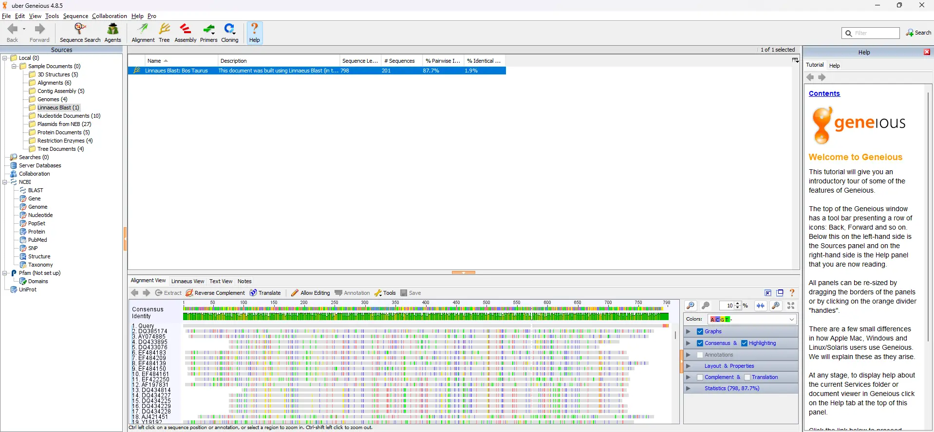 Использование Geneious начинается с импорта данных, которые могут быть загружены из локальных файлов или напрямую из онлайн-баз. После загрузки пользователь может применять различные инструменты анализа: запускать выравнивание, проводить поиск гомологий, строить филогенетические деревья или выполнять аннотирование. Все действия сопровождаются визуальными подсказками, а результаты отображаются в виде интерактивных графиков и таблиц, что упрощает их интерпретацию.