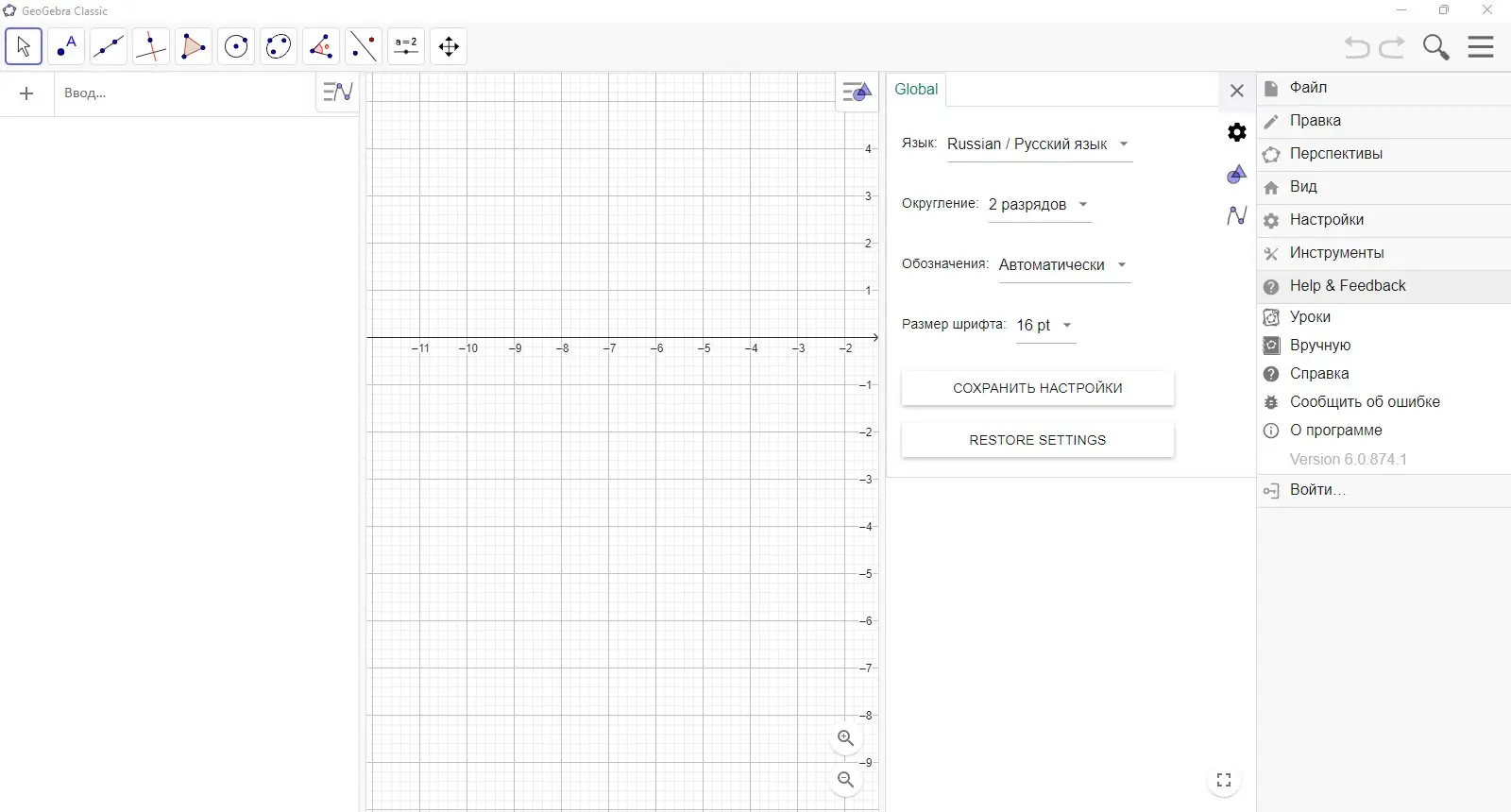 Использование GeoGebra начинается с выбора подходящего режима работы: классический интерфейс classic подходит для традиционного изучения алгебры и геометрии, в то время как режим 3d позволяет строить объёмные фигуры и исследовать их свойства в пространстве. Пользователь может вводить уравнения в поле ввода, и программа автоматически построит соответствующий график, а с помощью инструментов черчения — создавать точки, прямые, окружности и многоугольники с точным контрем параметров. Все объекты связаны между собой, поэтому изменение координат точки на плоскости мгновенно отразится на графике функции и в алгебраическом окне.