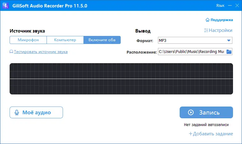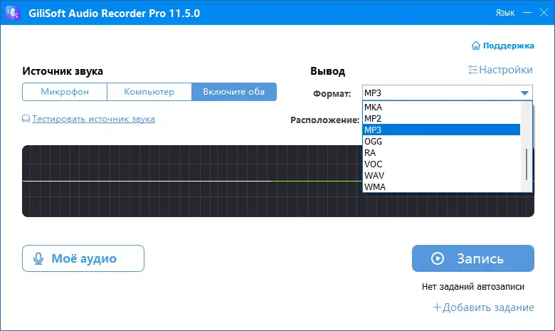 Gilisoft Audio Recorder — программа для высококачественной записи аудио с компьютера, микрофона или потоковых сервисов. Поддерживает множество форматов, включая MP3, WAV, WMA и FLAC. Идеально подходит для сохранения музыки с YouTube, онлайн-радио или подкастов.
