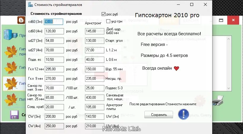 - Формирует смету с возможностью настройки цены на материалы в рублях и гривнах
