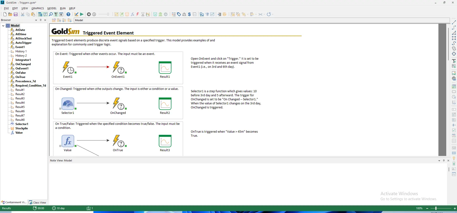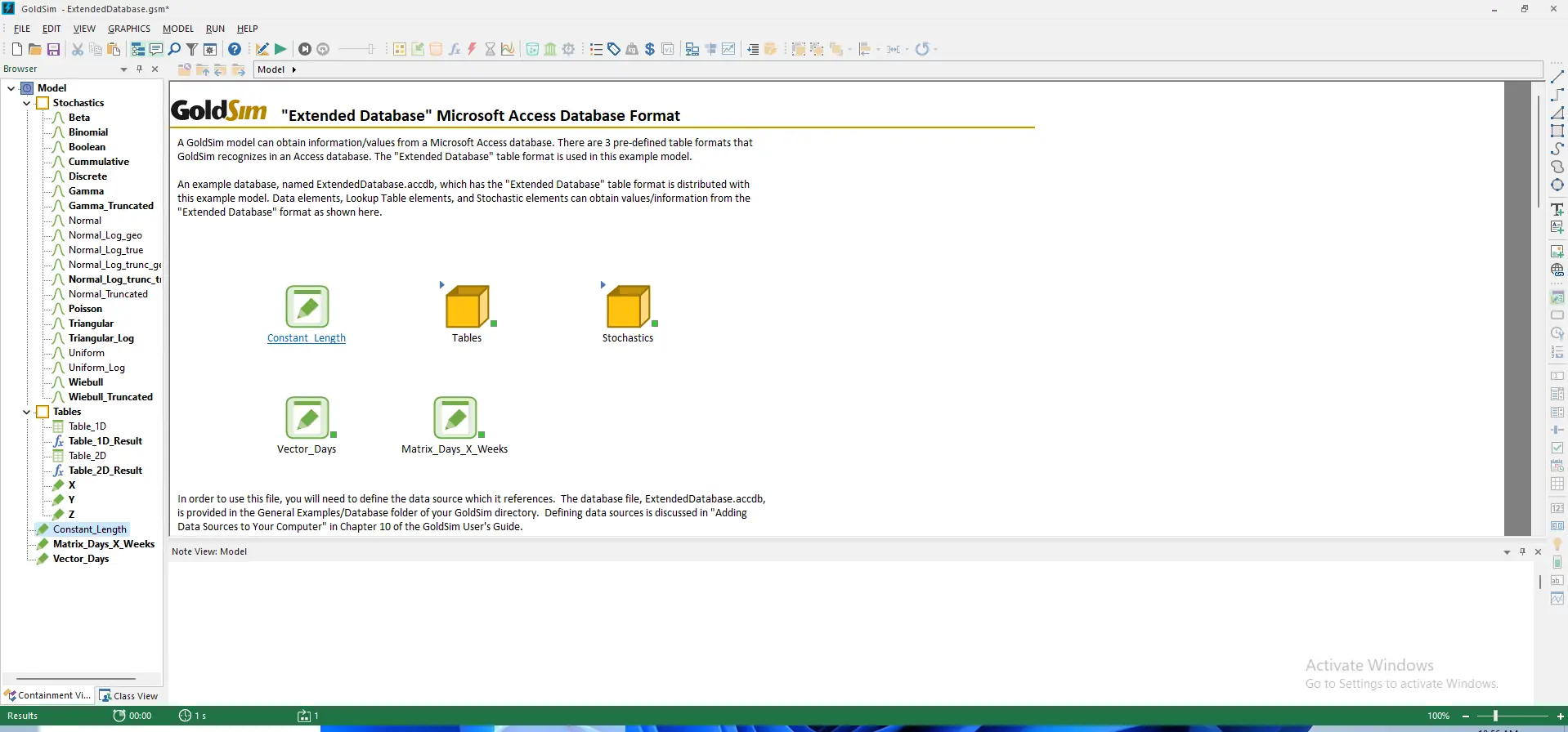Работа в GoldSim начинается с создания графической модели на рабочем поле. Пользователь добавляет объекты — контейнеры, резервуары, функции, триггеры — и соединяет их связями, определяя зависимости и потоки. Каждый элемент настраивается с помощью встроенных уравнений, логических правил или табличных данных. Программа поддерживает как детерминированные, так и стохастические расчёты, позволяя запускать множественные симуляции методом Монте-Карло. Результаты отображаются в виде графиков, таблиц и диаграмм, которые можно экспортировать или включить в отчёт.