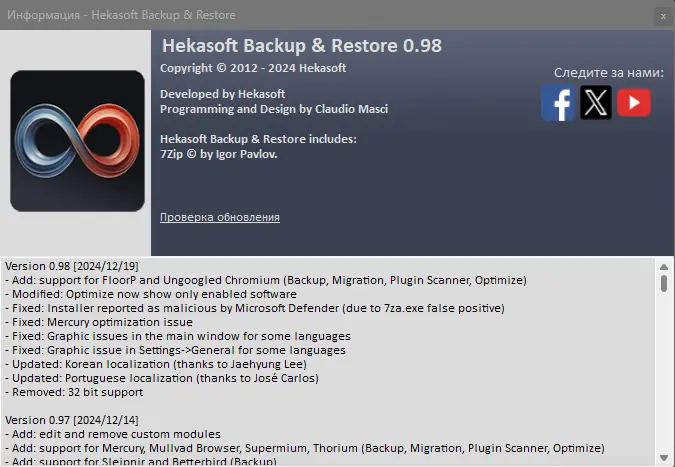 Программа доступна для загрузки в стационарной и портативной версиях, последняя не требует установки и может запускаться с внешнего носителя. Регулярные обновления добавляют поддержку новых приложений и исправляют выявленные ошибки, как, например, ложное срабатывание антивируса Microsoft Defender, устранённое в версии 0.98. Также в этом обновлении добавлена поддержка Ungoogled Chromium и FloorP, улучшена локализация и графическое отображение интерфейса. Hekasoft Backup & Restore продолжает развиваться, оставаясь надёжным инструментом для управления профилями и данных.