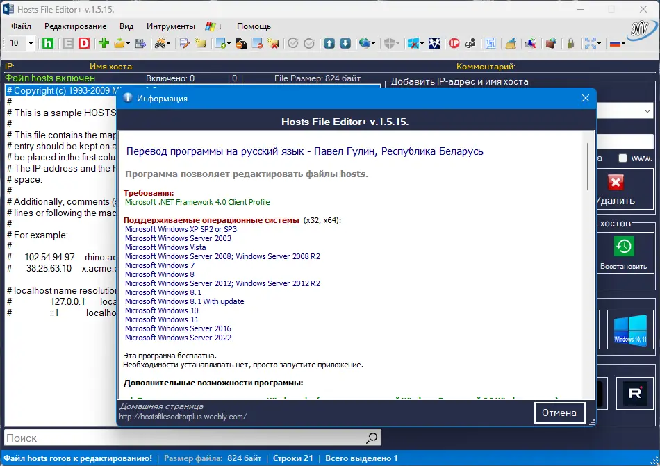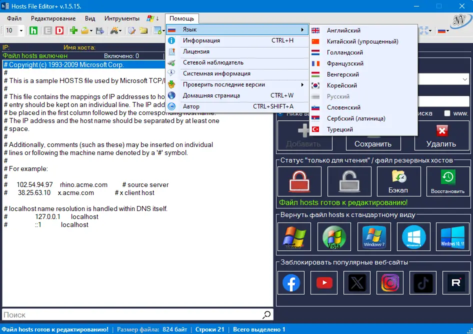 Hosts File Editor+ доступна для бесплатного скачивания в портативной версии, что обеспечивает максимальную гибкость и безопасность использования. Утилита поддерживает русский язык интерфейса и адаптирована для работы на всех актуальных 32- и 64-битных системах Windows. В последней версии v.1.5.15 добавлен перевод на венгерский язык, улучшена работа встроенных инструментов и реализована очистка виртуальной памяти через pagefile.sys. Также устранены мелкие ошибки, повышающие стабильность работы.