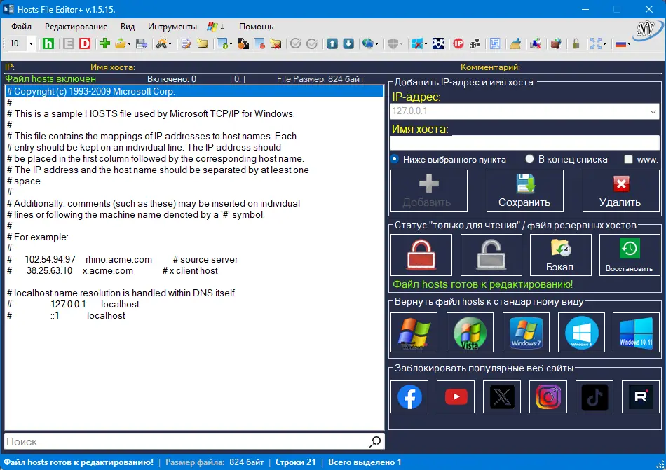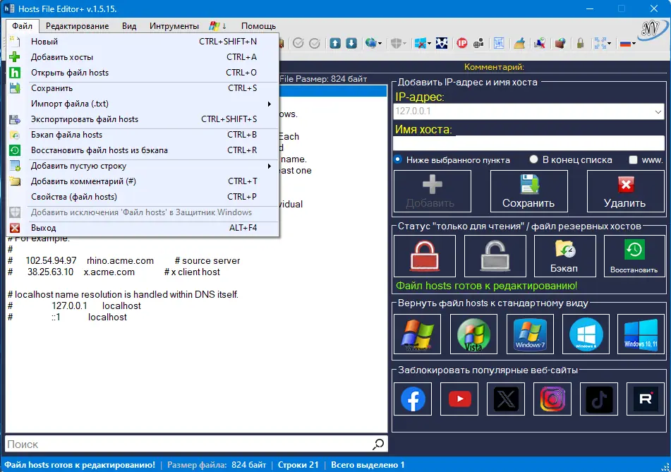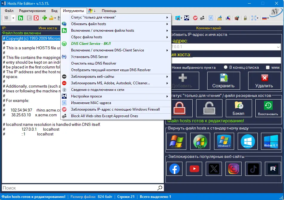 - Редактирование и управление записями в host-файле с возможностью добавления, изменения и удаления правил.