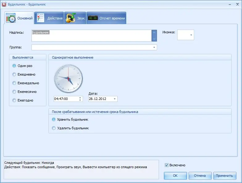 После запуска программы пользователь видит простой интерфейс с панелью управления будильниками. Добавление нового напоминания происходит через диалоговое окно, где указывается время, дни активации и тип действия. Можно выбрать воспроизведение аудиофайла, запуск исполняемого файла или переход по ссылке. Дополнительно доступна настройка громкости — как фиксированной, так и с постепенным нарастанием. Интерфейс поддерживает локализацию, включая русский язык, что упрощает первоначальную настройку.