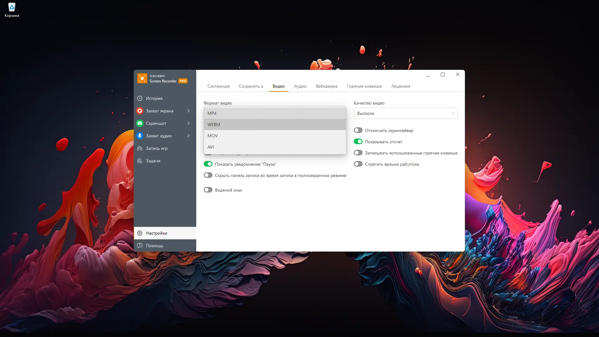 - Гибкие настройки вывода: форматы, качество, звук, веб-камера