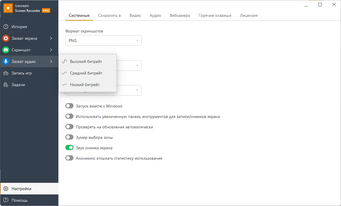 - Поддержка записи системного звука и микрофона одновременно