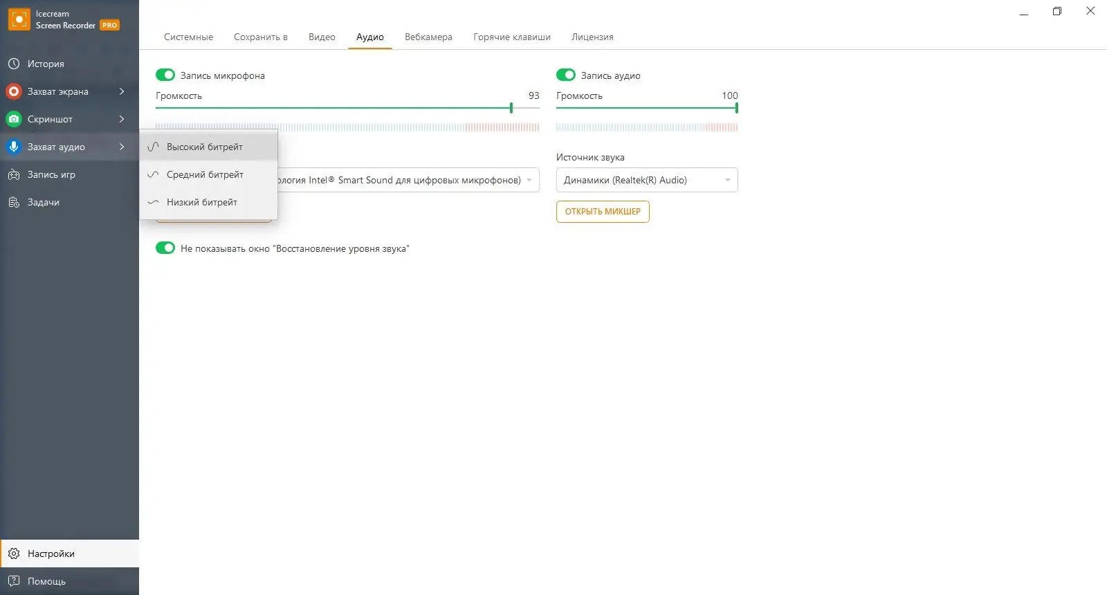- Фиксация системного звука и микрофона одновременно