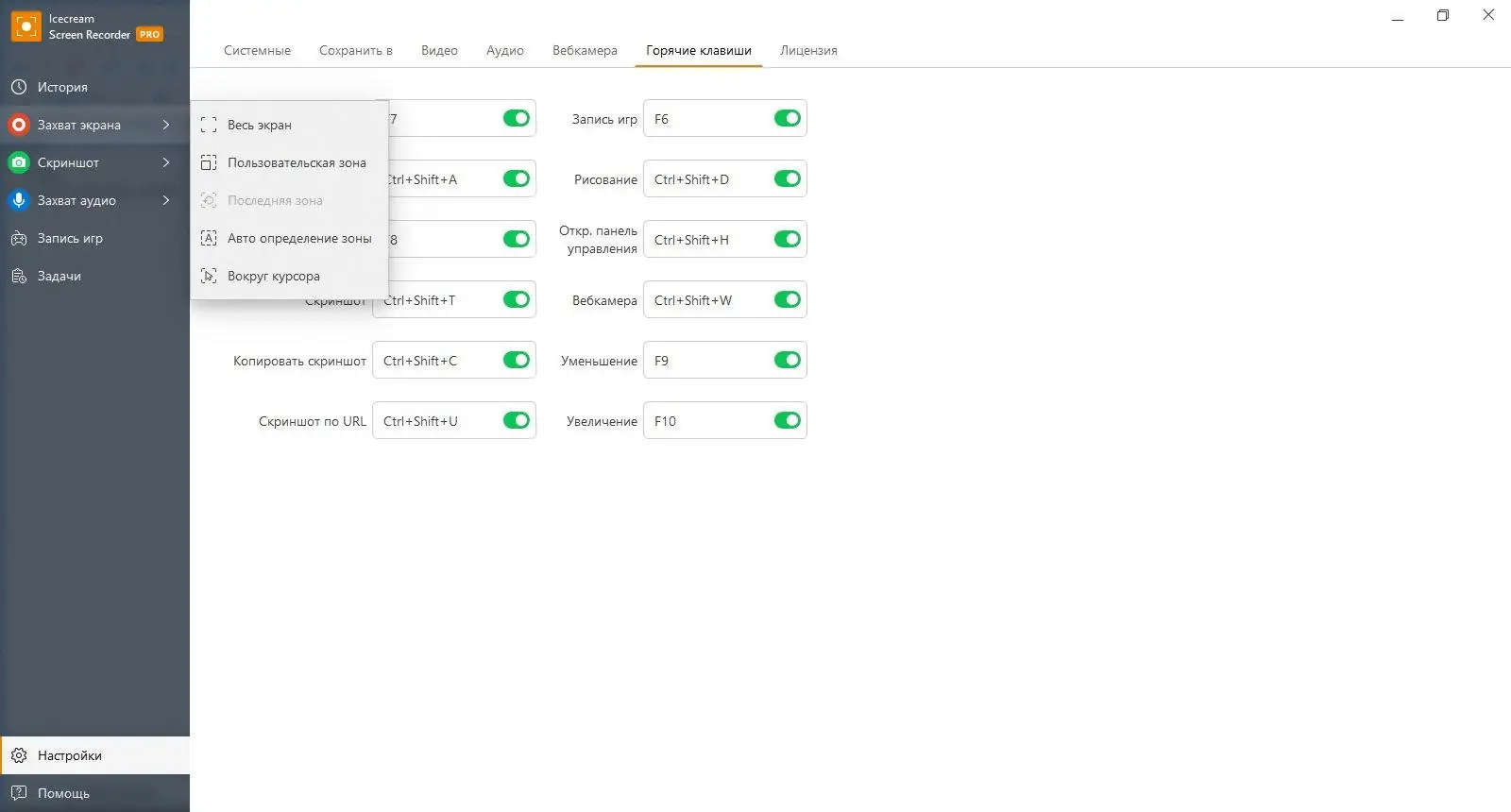 - Захват видео с экрана в выбранной зоне или полноэкранном режиме