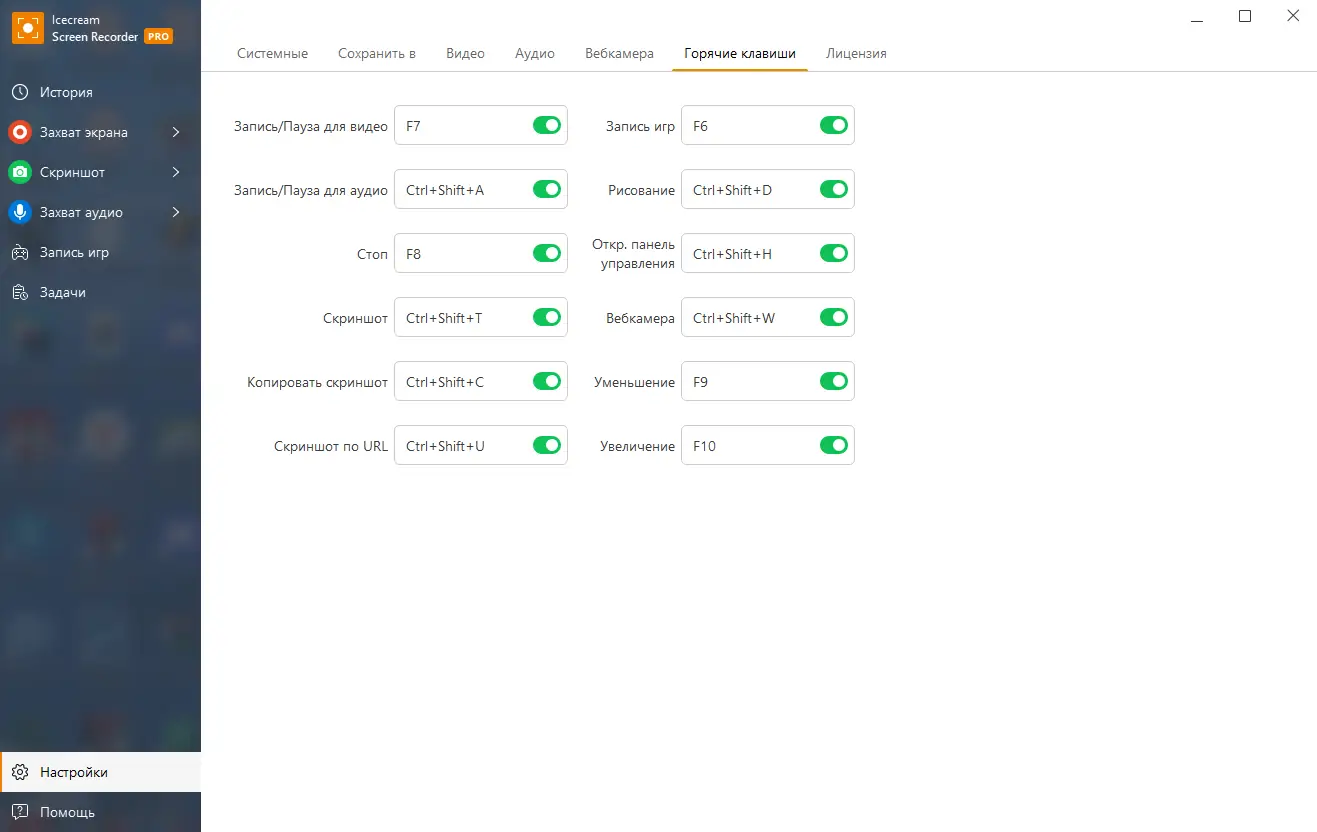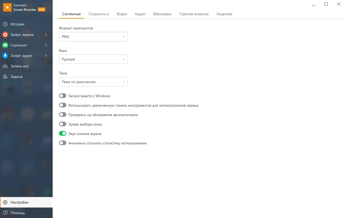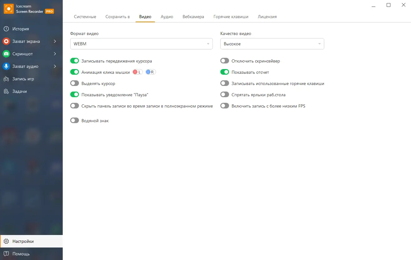 - Гибкие настройки записи: выбор зоны, источника звука, веб-камеры и формата.