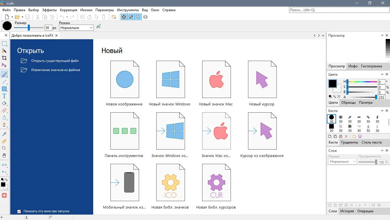 - Создание и редактирование иконок и курсоров различных размеров и форматов