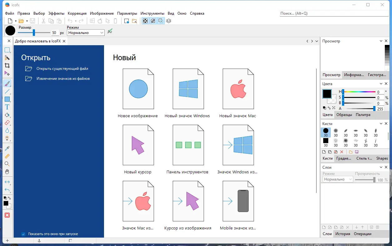 IcoFX — мощное приложение для создания и редактирования иконок, курсоров и логотипов с поддержкой слоёв и прозрачности. Программа поддерживает статические и анимированные курсоры, конвертацию изображений в иконки, а также извлечение ресурсов из исполняемых файлов. Работает с популярными форматами: BMP, PNG, JPG, TIFF, GIF и JPEG2000. Утилита подойдёт как дизайнерам, так и разработчикам, которым необходимо быстро подготовить графические элементы интерфейса. В комплекте доступна portable-версия, не требующая установки. Обратите внимание: при инсталляции предлагается установка стороннего программного обеспечения — его нужно отклонить.