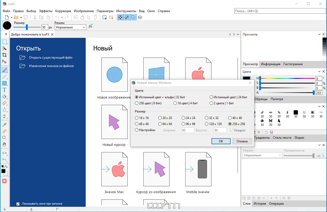 - Создание и редактирование иконок и курсоров различного размера и цветовой глубины.