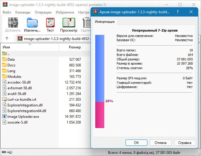Image Uploader доступен для скачивания в портативной версии, не требующей установки. Архив имеет высокую степень сжатия и включает все необходимые компоненты, включая библиотеку FFmpeg. Перед использованием рекомендуется проверить контрольные суммы. Программа совместима с современными версиями Windows и поддерживает работу в 32- и 64-битных системах.