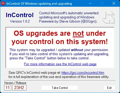 InControl — это компактная утилита, позволяющая пользователям Windows 10 и 11 взять под контроль автоматические обновления операционной системы. Программа блокирует нежелательные апгрейды версий, оставляя при этом доступ к ежемесячным обновлениям безопасности.