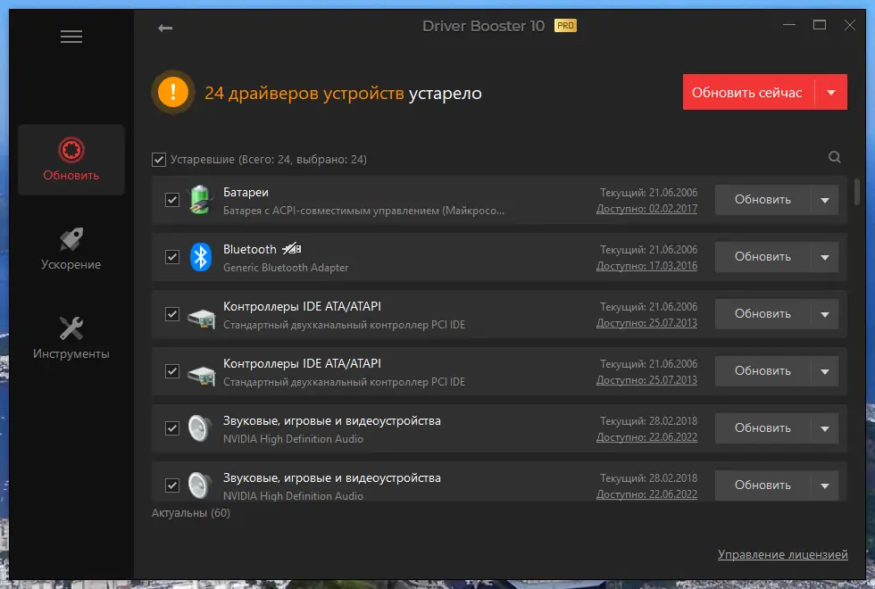- Автоматическое сканирование системы на наличие устаревших драйверов