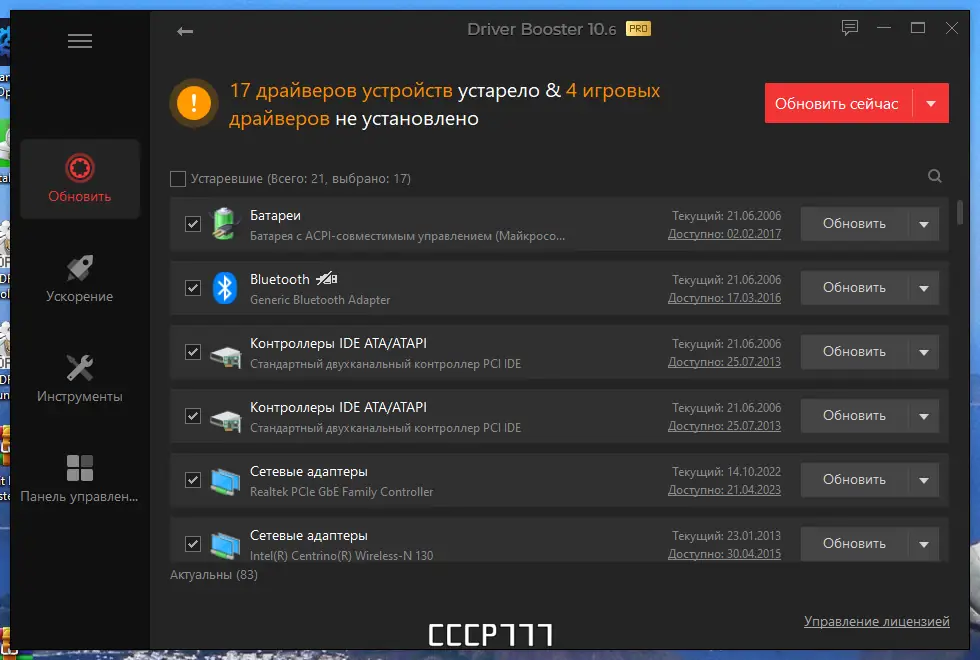 - Автоматически определяет устаревшие драйверы и предлагает их замену на более свежие версии.