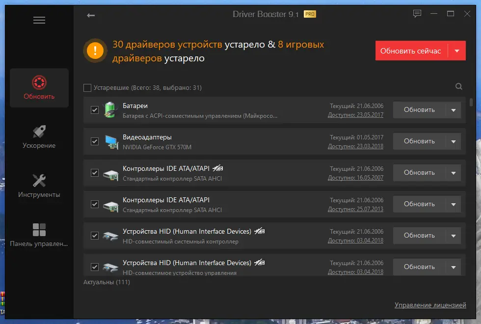 - Автоматическое определение устаревших драйверов без участия пользователя
