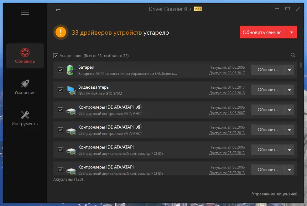 - Автоматическое сканирование системы на наличие устаревших драйверов