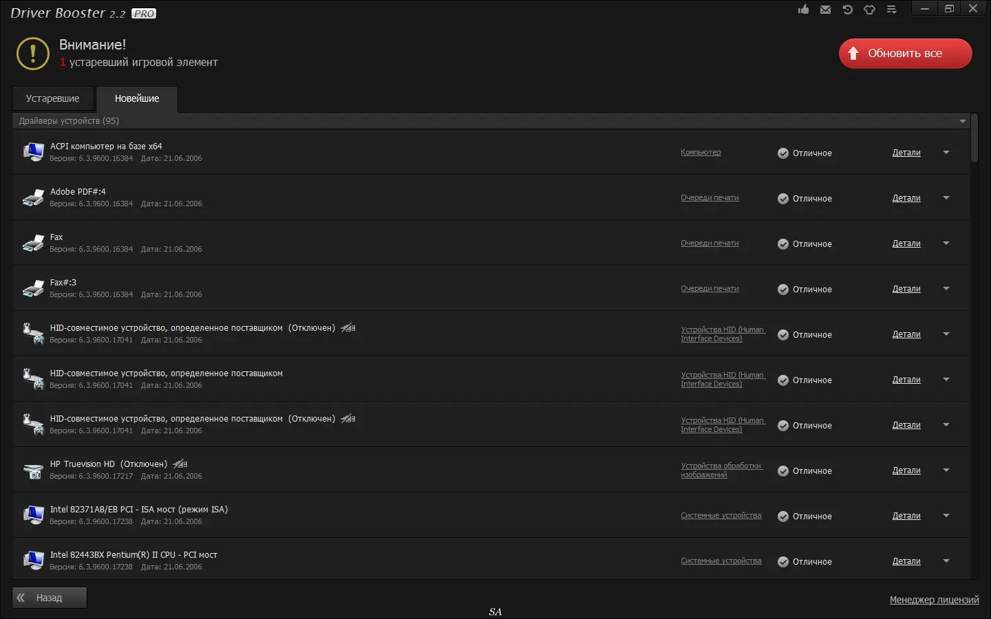 - Система диагностики проверяет все подключённые устройства на наличие устаревших драйверов.