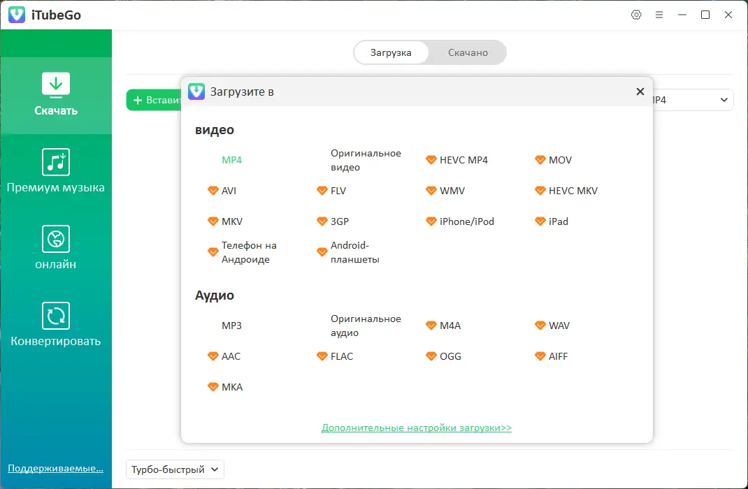 Интеграция конвертера позволяет использовать iTubeGo не только как downloader, но и как многофункциональный медиаменеджер.