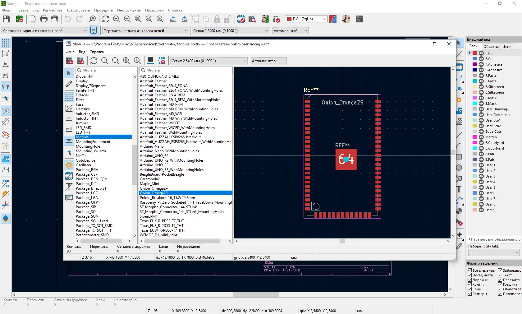 - Интегрированный cvpcb помогает сопоставить компоненты из схемы с их посадочными местами на плате.