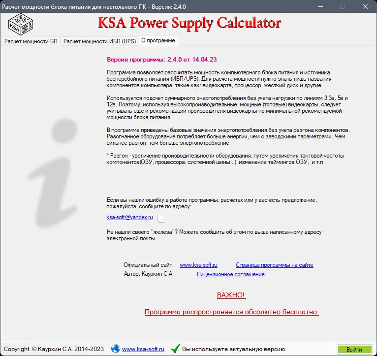 KSA Power Supply Calculator WorkStation — это компактное приложение для точного расчёта необходимой мощности блока питания и ИБП на основе выбранных компонентов компьютера. Программа работает автономно, не требует установки и подходит для использования на любом ПК с Windows.