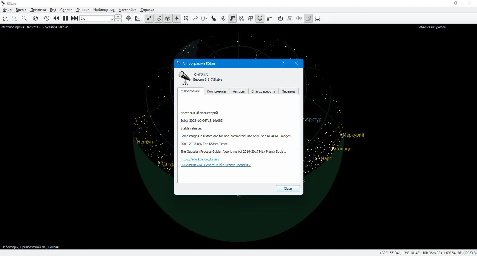 KStars — это мощное кроссплатформенное приложение с открытым исходным кодом, предназначенное для точной визуализации ночного неба в любое время и в любой точке планеты. Программа отображает миллионы звёзд, планеты Солнечной системы, объекты глубокого космоса, астероиды, кометы и спутники, обеспечивая детализированную симуляцию астрономических явлений. С её помощью можно изучать движение небесных тел, планировать наблюдения, заниматься астрофотографией и проводить образовательные эксперименты с высокой точностью.