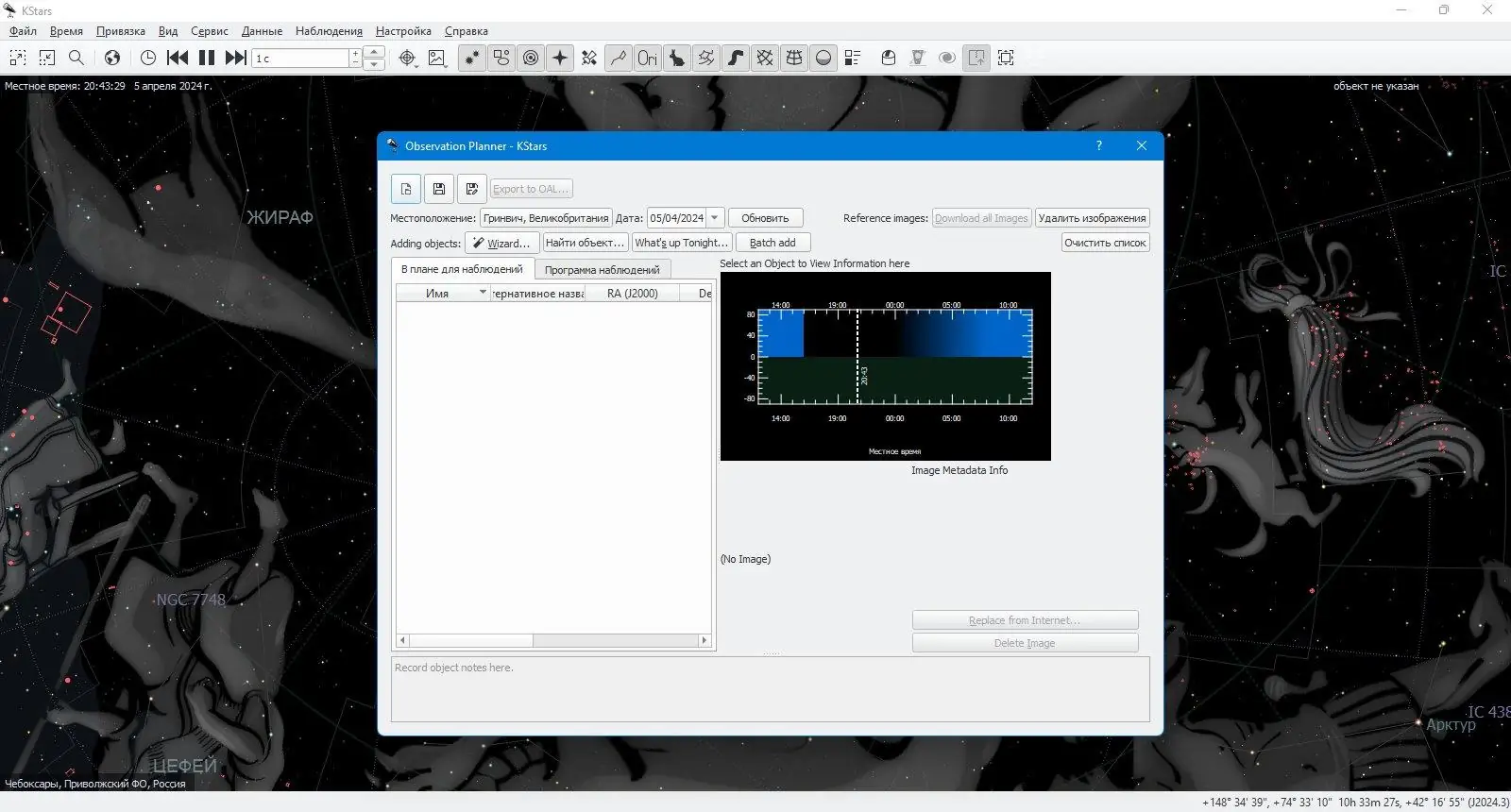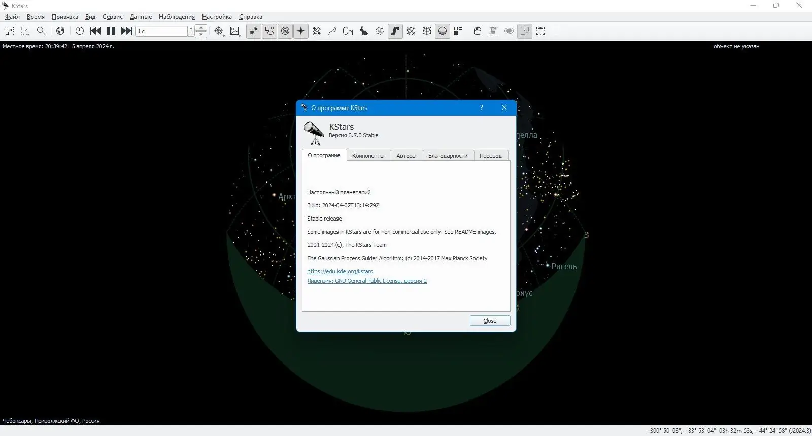 KStars — это мощное бесплатное программное обеспечение с открытым исходным кодом, предназначенное для моделирования ночного неба с высокой точностью. Программа позволяет наблюдать звёздное небо с любой точки планеты, в любое время и дату, визуализируя сотни миллионов звёзд, планеты, спутники, кометы и объекты глубокого космоса. Подходит как для студентов и преподавателей, так и для астрономов-любителей, увлекающихся визуальными наблюдениями или астрофотографией.