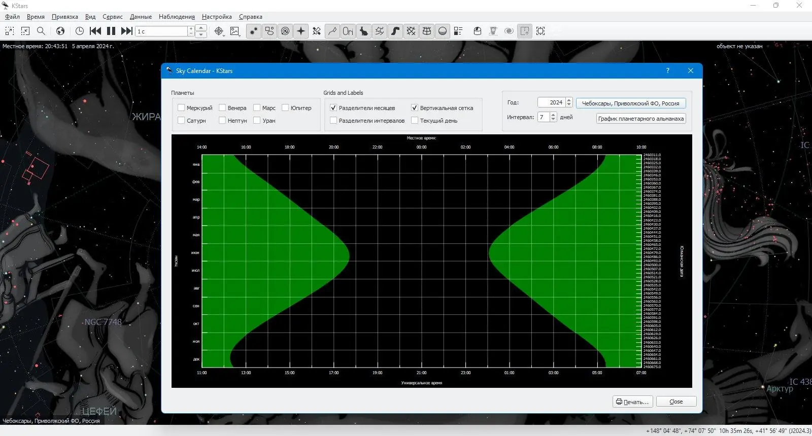 - Встроенный астроскалькулятор помогает рассчитывать соединения, высоту объектов над горизонтом и другие параметры видимости.