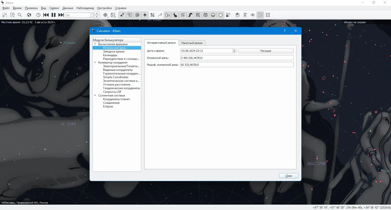 - Встроенный астрокалькулятор для выполнения сложных расчётов, включая соединения и противостояния.