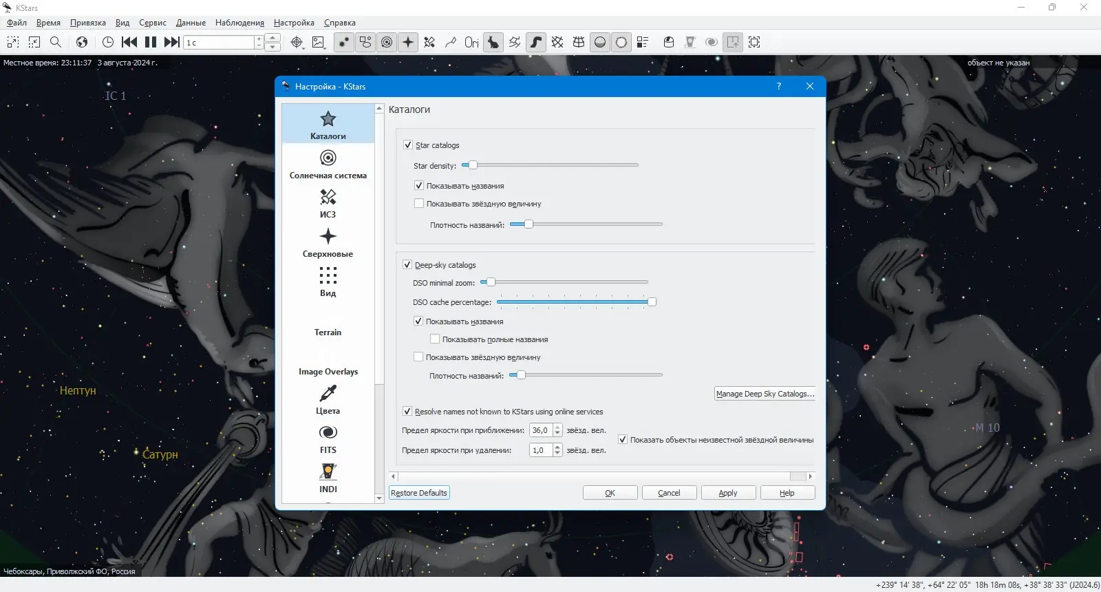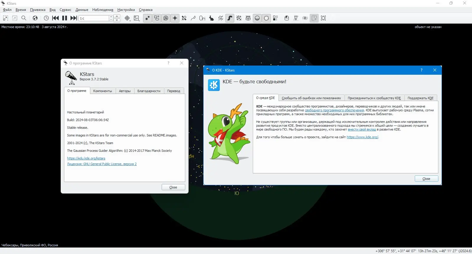 KStars — это бесплатное кроссплатформенное приложение с открытым исходным кодом, предназначенное для моделирования ночного неба с высокой точностью. Программа отображает положение звёзд, планет, спутников, комет и тысяч объектов глубокого космоса с учётом времени, даты и географического положения наблюдателя. Она подходит как для образовательных целей, так и для серьёзных астрономических расчётов и астрофотографии.